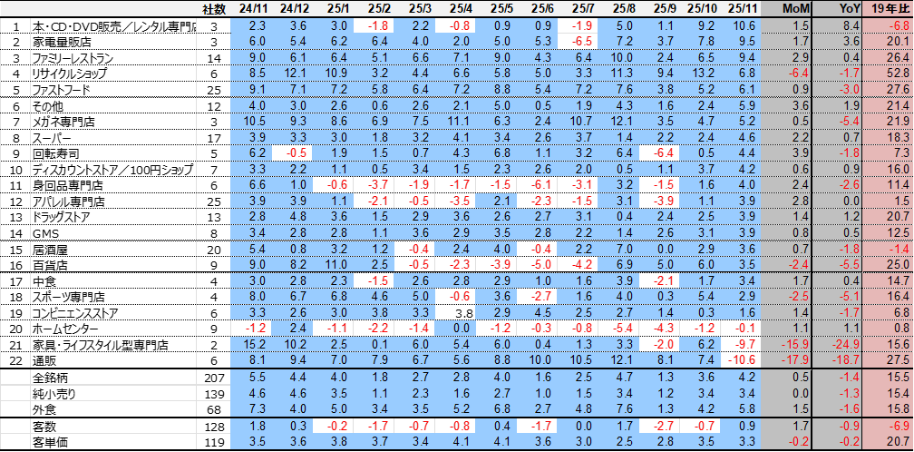 11月の小売業合計既存店売上高は、前年同月比4.2%増、うち純小売りは3.4%増、外食は5.8%増。プラスのサブセクター数は、19サブセクター。同2019年対比では、20サブセクターとなりました。