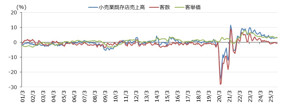 図表2:既存店売上高・客数・客単価前年比3ヶ月移動平均値の推移(%)