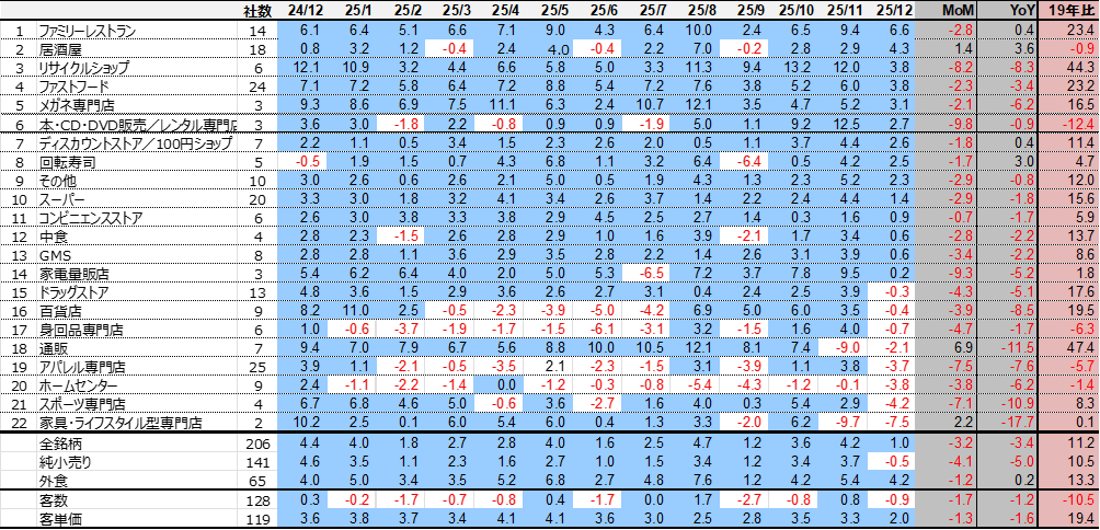 12月の小売業合計既存店売上高は、前年同月比1.0%増、うち純小売りは0.5%減、外食は4.2%増。プラスのサブセクター数は、14サブセクター。同2019年対比では、17サブセクターとなりました。