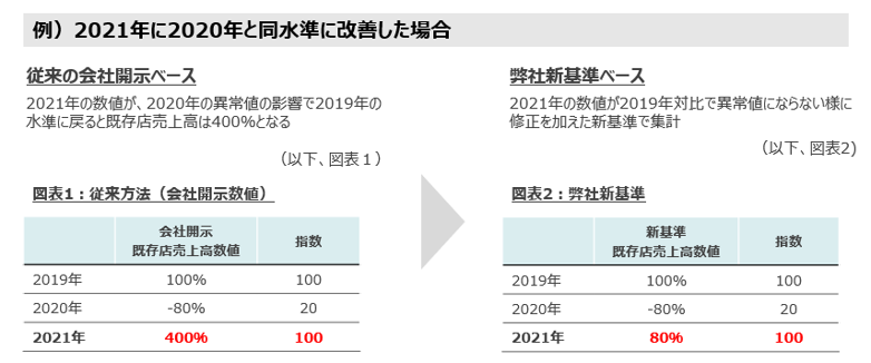 なお、2020年の既存店売上高は新型コロナ感染症の影響による異常値で、2021年の同会社発表伸長率から実態を把握することが難しいため、実態に則した修正を行っております。新基準の詳細につきましては、本レポートの末尾をご覧ください。